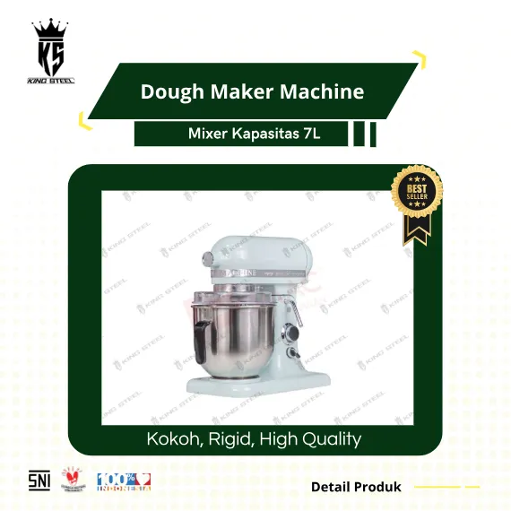 Dough Maker Machine (Mixer) kapasitas 7 L adalah mesin pencampur adonan yang dirancang untuk mempermudah dan mempercepat proses pembuatan roti serta kue. Dengan menggunakan mesin ini, Anda dapat mengaduk adonan dengan lebih efisien dan efektif. Mixer ini dilengkapi dengan motor bertenaga tinggi yang dirancang untuk penggunaan jangka panjang. Berkat fitur 11 tingkat kecepatan serta tiga jenis pengaduk (Whisk, Hook, dan Flat Beater), mesin ini mampu mengolah berbagai jenis adonan, mulai dari yang cair hingga kalis.