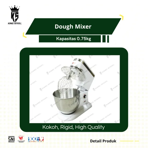 Dough Mixer atau mesin pengaduk adonan kapasitas 0.75 kg merupakan mesin yang dirancang untuk mencampur berbagai jenis adonan secara cepat dan efisien. Penggunaan mesin ini dapat meningkatkan produktivitas serta kualitas adonan, sehingga menghasilkan produk makanan dengan tekstur yang lebih baik. Dibuat dari bahan besi anti karat dengan wadah berbahan stainless steel, mesin ini memastikan proses pencampuran yang higienis dan tahan lama. Dilengkapi dengan berbagai jenis pengaduk, mesin ini dapat bekerja dengan kecepatan tinggi untuk memastikan adonan tercampur secara merata.